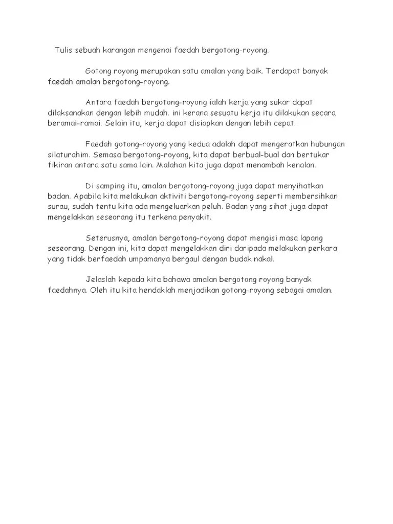 Kebaikan amalan gotong royong dalam masyarakat (kelebihan). Sesuatu kerja,kerja itu dapat diselesaikan dalam masa yang singkat. ١٨ ربيع الأول ١٤٣٣ هـ. Karangan online worksheet for tingkatan 1.